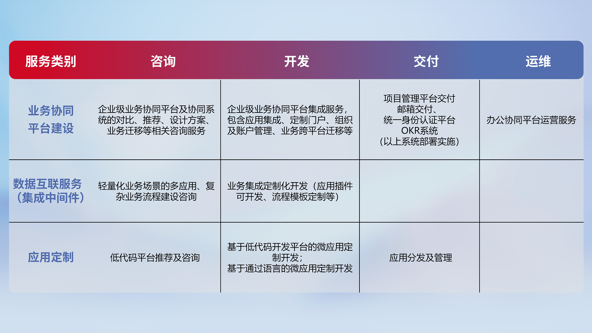 针对钉钉、、企微、、、、IDaas等平台级产品提供产品的规划、、方案、、、交付、、、、定制化开发等服务,,实现如统一协同办公、、智能客户服务、、混合会议管理、、、、智能数据查询、、、等业务场景,,实现数字化转型。。。