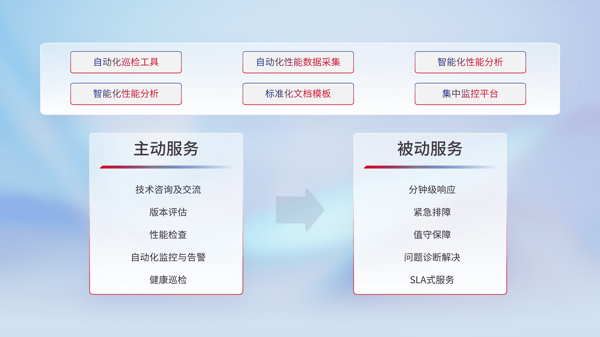 智能化工具和标准化文档,,,保障服务质量,,,提供主动服务(包含技术咨询、、、、版本评估、、性能检查、、自动化监控与告警、、健康巡检)和被动服务包含(分钟级响应、、、、紧急排障、、、、值守保障、、问题诊断解决、、SLA服务)。。。。